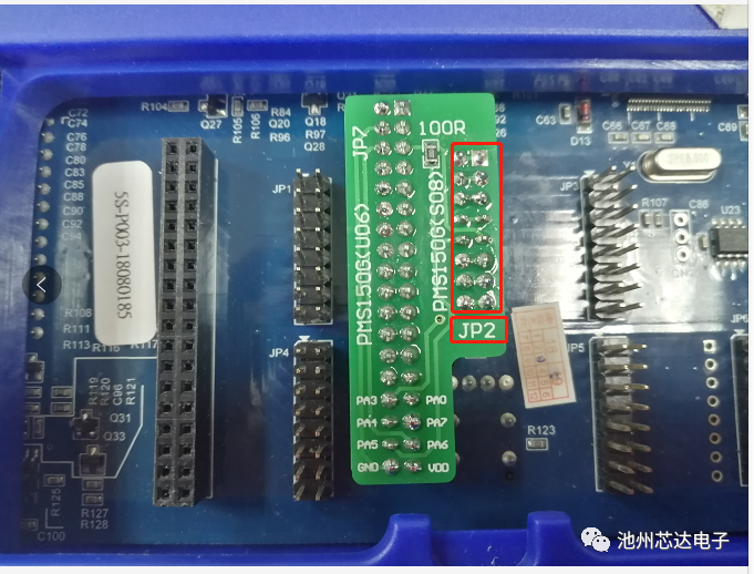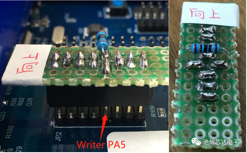 以PMS150G-S08為例,為提升IC批量燒錄的穩(wěn)定性及可靠性,燒錄前,請(qǐng)?jiān)赪riter背后JP2的PA5引腳上串一個(gè)100?的電阻。連接方式參考如下圖: